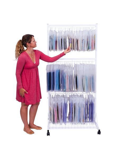Sturdy frame made from powder-coated steel. With three adjustable rails it gives you loads of space to hang books, headphones etc. Can be adjusted to suit all size book bags.
