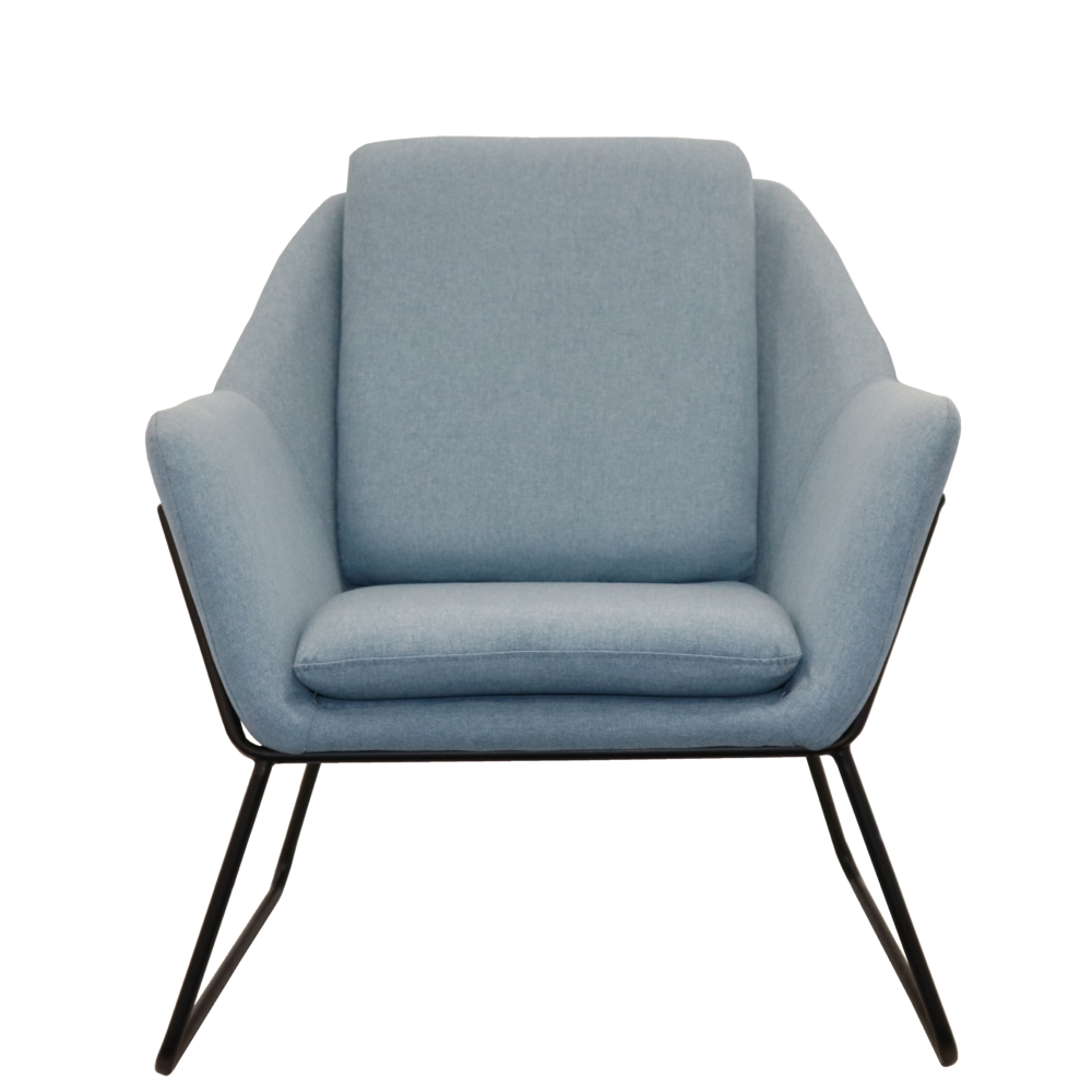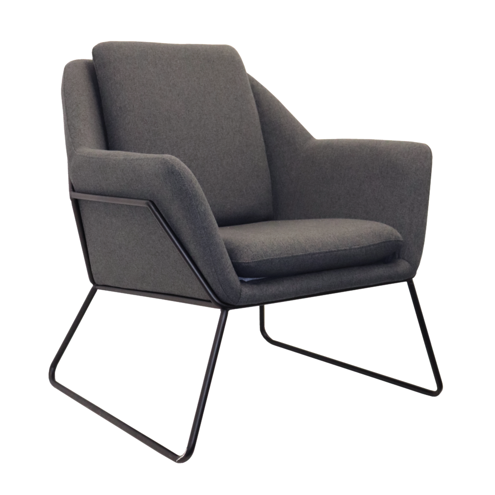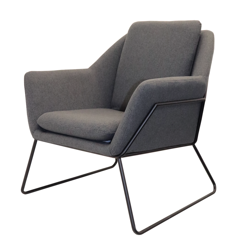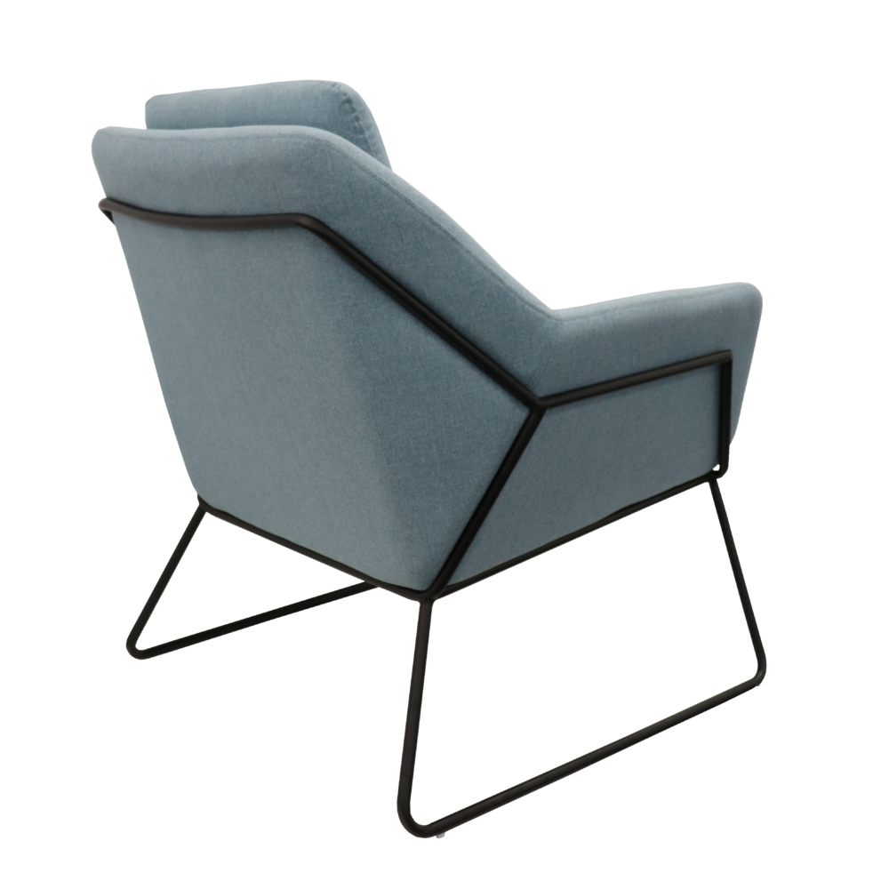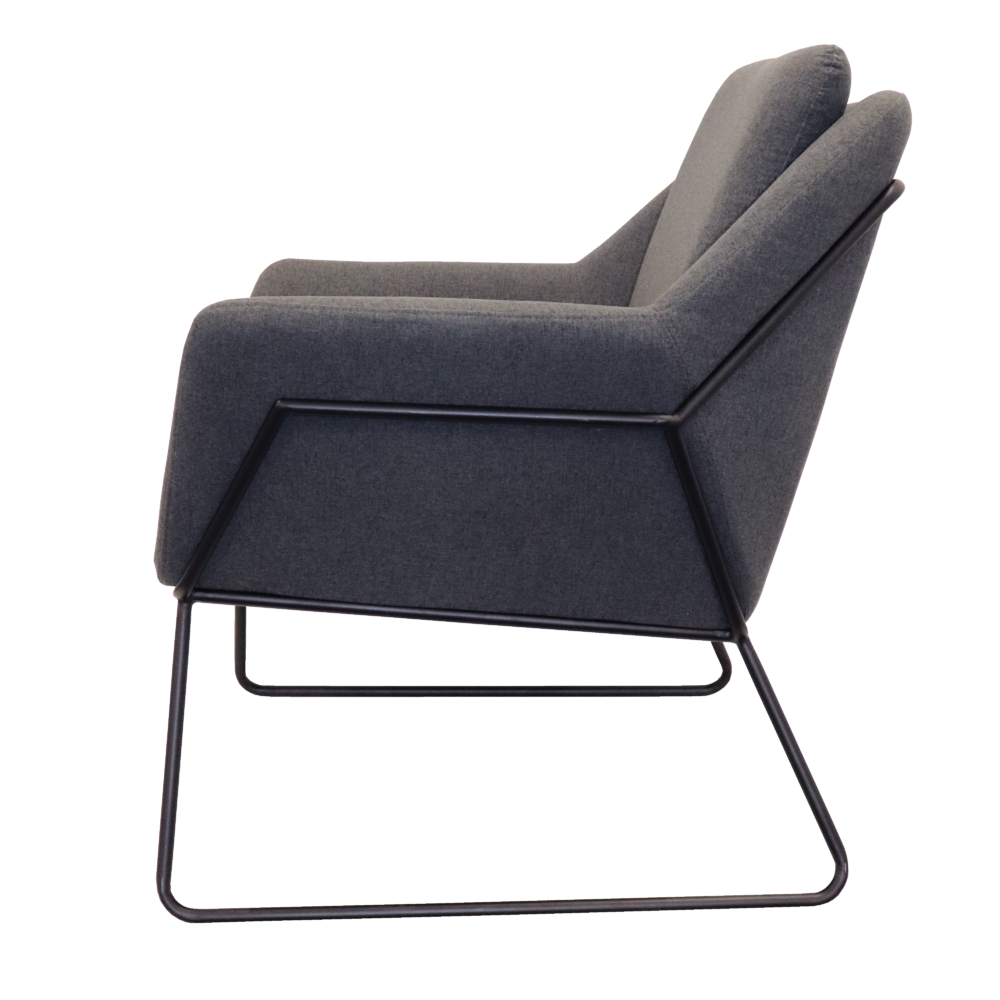 Lounge arm chair suitable for reception or break out areas. Upholstered in light blue or charcoal ash fabric, with a sturdy black solid tube frame with rubber feet.