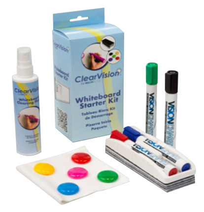 - VA0009 – Whiteboard Starter Kit – Includes: Cleaning Fluid, 5x Coloured Magnets, Whiteboard Eraser. 4x Whiteboard Makers and 5x Cleaning Cloths