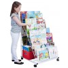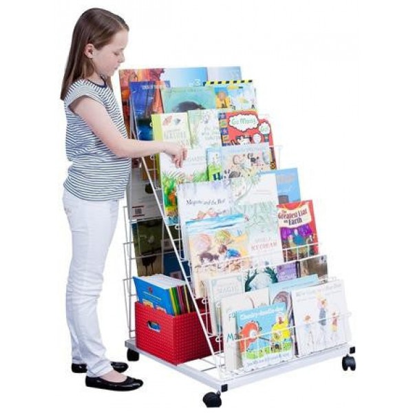 A library in your classroom! This mobile stand has 13 levels, 7 on the front (angled) side and 6 on the back (vertical) side. The front pockets measure 8cm deep x 25cm high, and the back pockets measure 2.5cm deep x 19cm high. A storage tray utilises the space below.