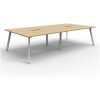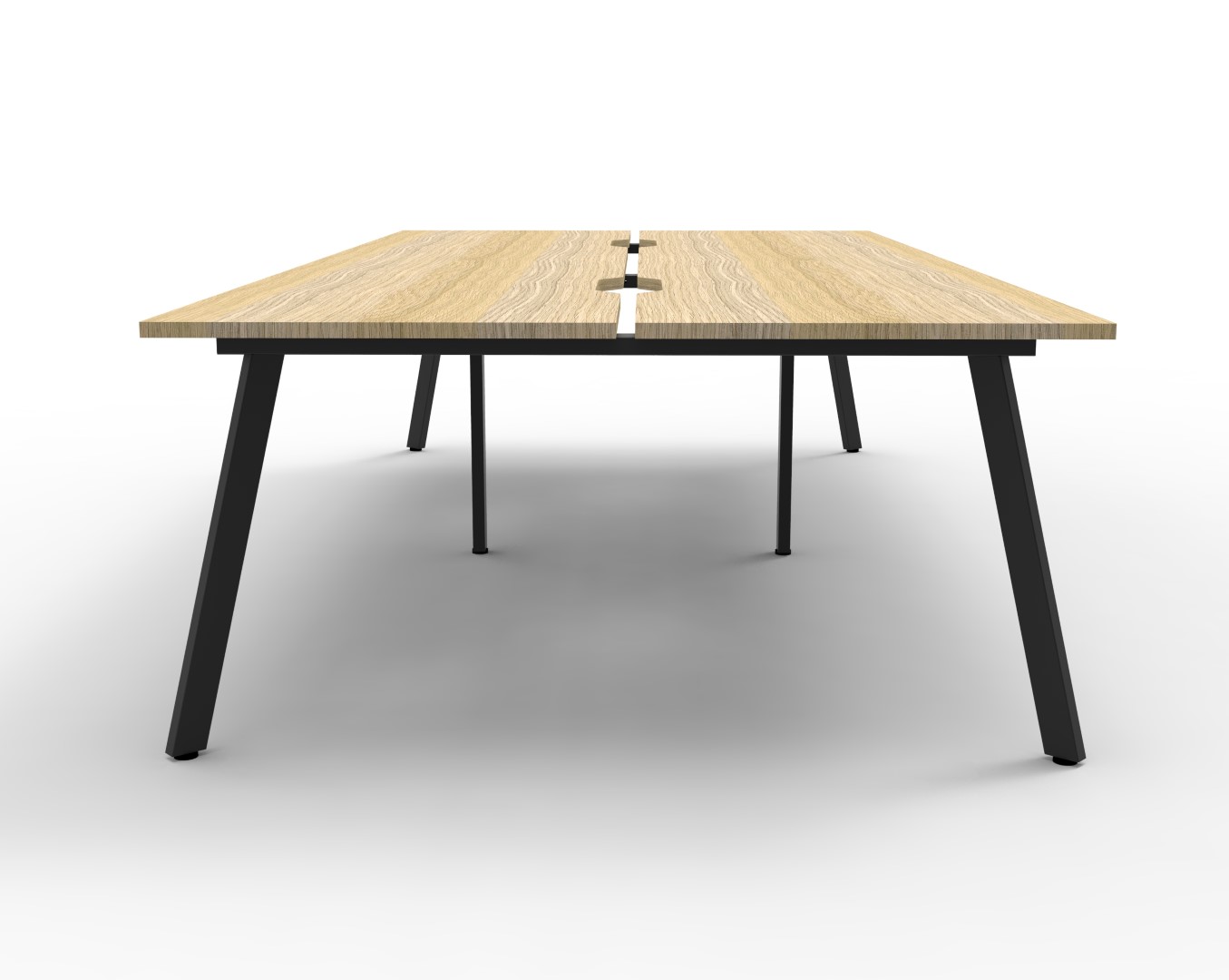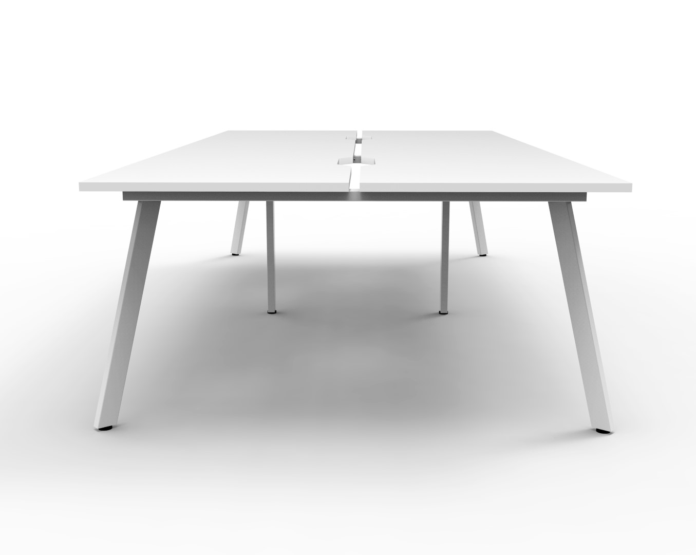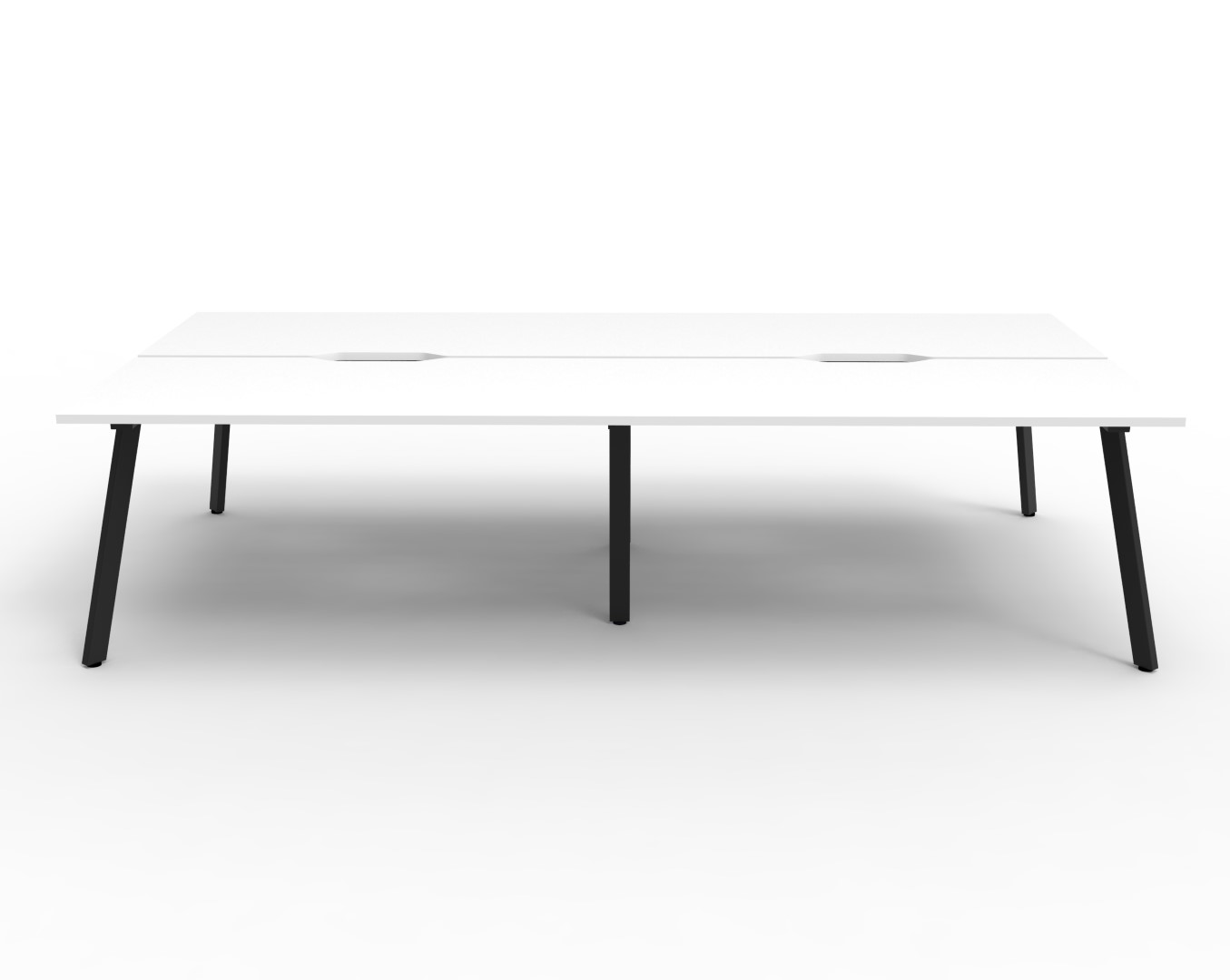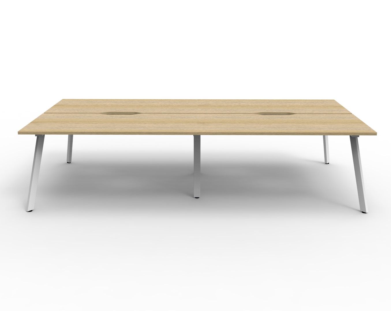 Eternity 4 Person Double Sided Workstation – No Screen | E0 Enviroboard Top With 410mm W x 50mm D Scallop | 30mm Cable Access Void In Between Double Sided Users – Infill Rail Avail. At An Additional Cost | 3000mm W x 1530mm D x 730mm H ( Overall ), 1500mm W x 750mm D x 730mm H Per User | 60mm x 30mm Splayed Leg, P/C Underframe | Adjustable Levelling Feet|Dual Cross Bar For Added Stability