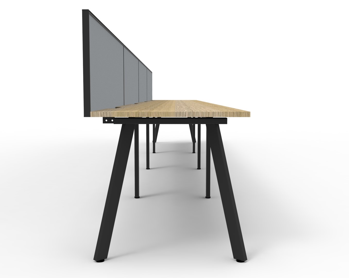 6000mm W x 780mm D x 730mm H ( Overall ), 1200mm W x 750mm D x 730mm H Per User | 60mm x 30mm Splayed Leg | 495mm H x 30mm T Pinnable Fabric Privacy Screen|Adjustable Levelling Feet|Dual Cross Bar For Added Stability