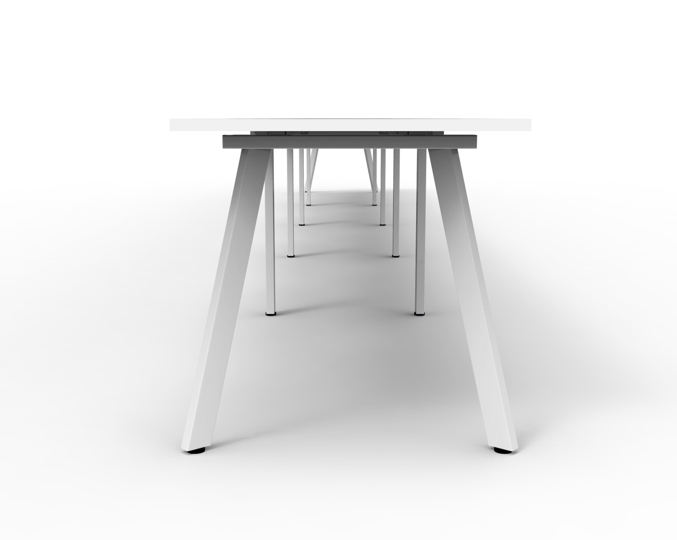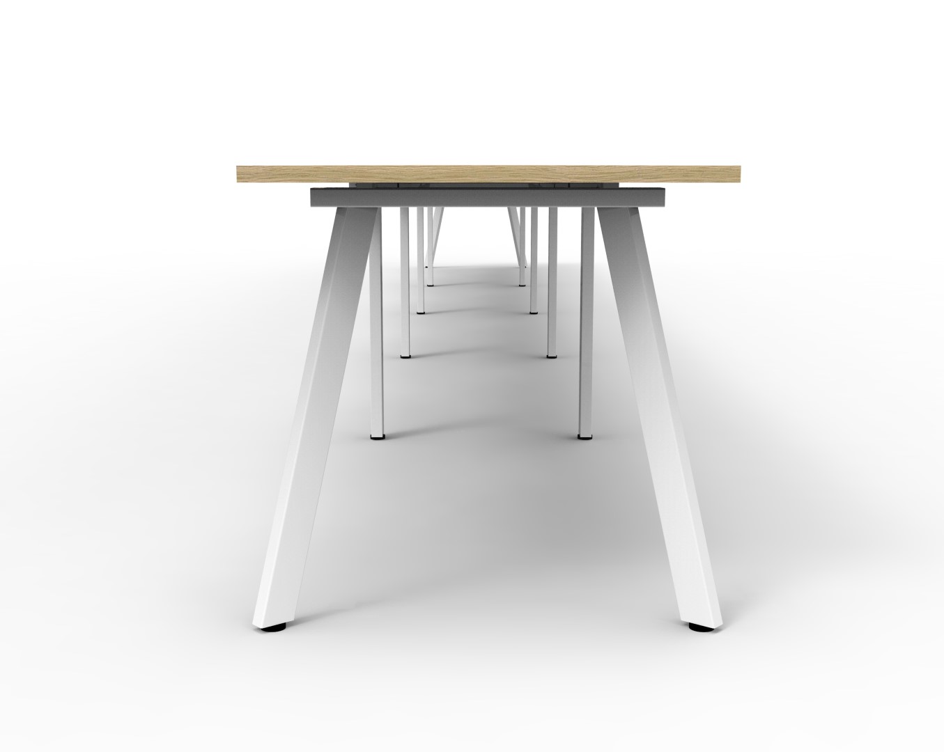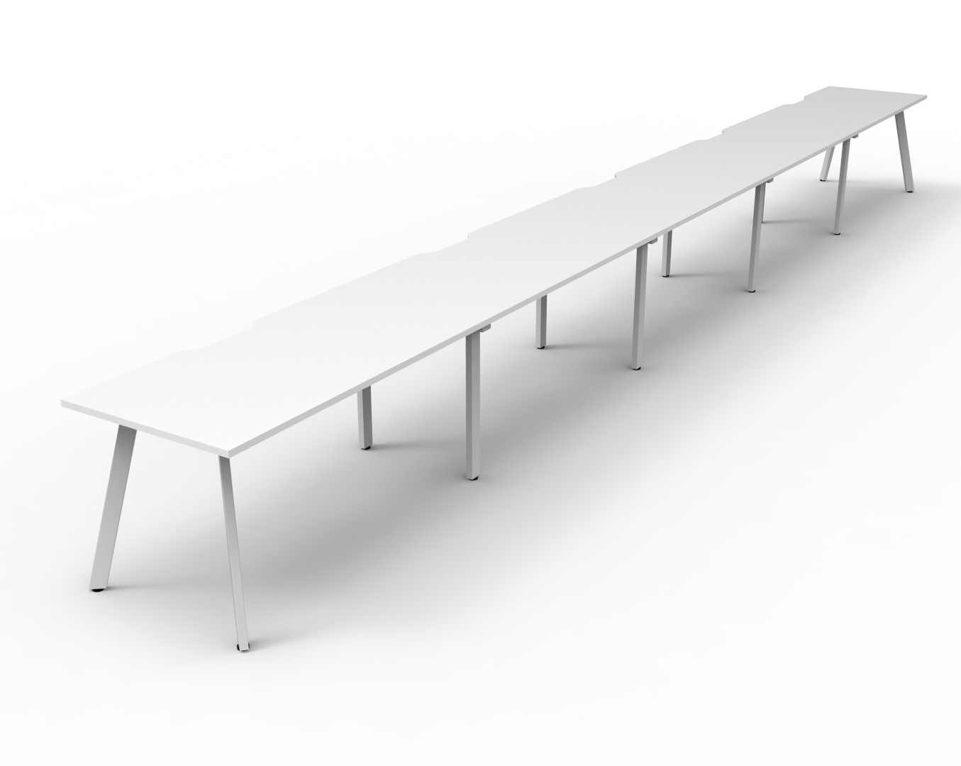 7500mm W x 750mm D x 730mm H ( Overall ), 1200mm W x 750mm D x 730mm H Per User | 60mm x 30mm Splayed Leg, P/C Underframe | Adjustable Levelling Feet | Dual Cross Bar For Added Stability | E0 Enviroboard Melamine Worksurface