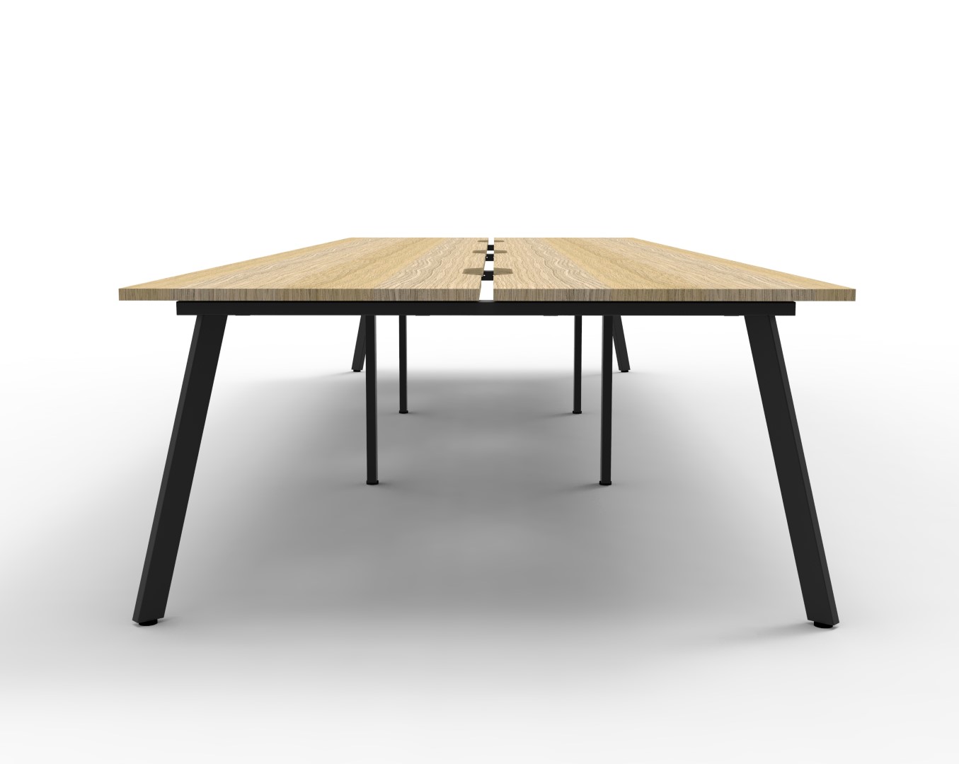 Eternity 6 Person Double Sided Workstation – No Screen | E0 Enviroboard Top With 410mm W x 50mm D Scallop | 30mm Cable Access Void In Between Double Sided Users – Infill Rail Avail. At An Additional Cost | 4500mm W x 1530mm D x 730mm H ( Overall ), 1500mm W x 750mm D x 730mm H Per User | 60mm x 30mm Splayed Leg, P/C Underframe | Adjustable Levelling Feet|Dual Cross Bar For Added Stability