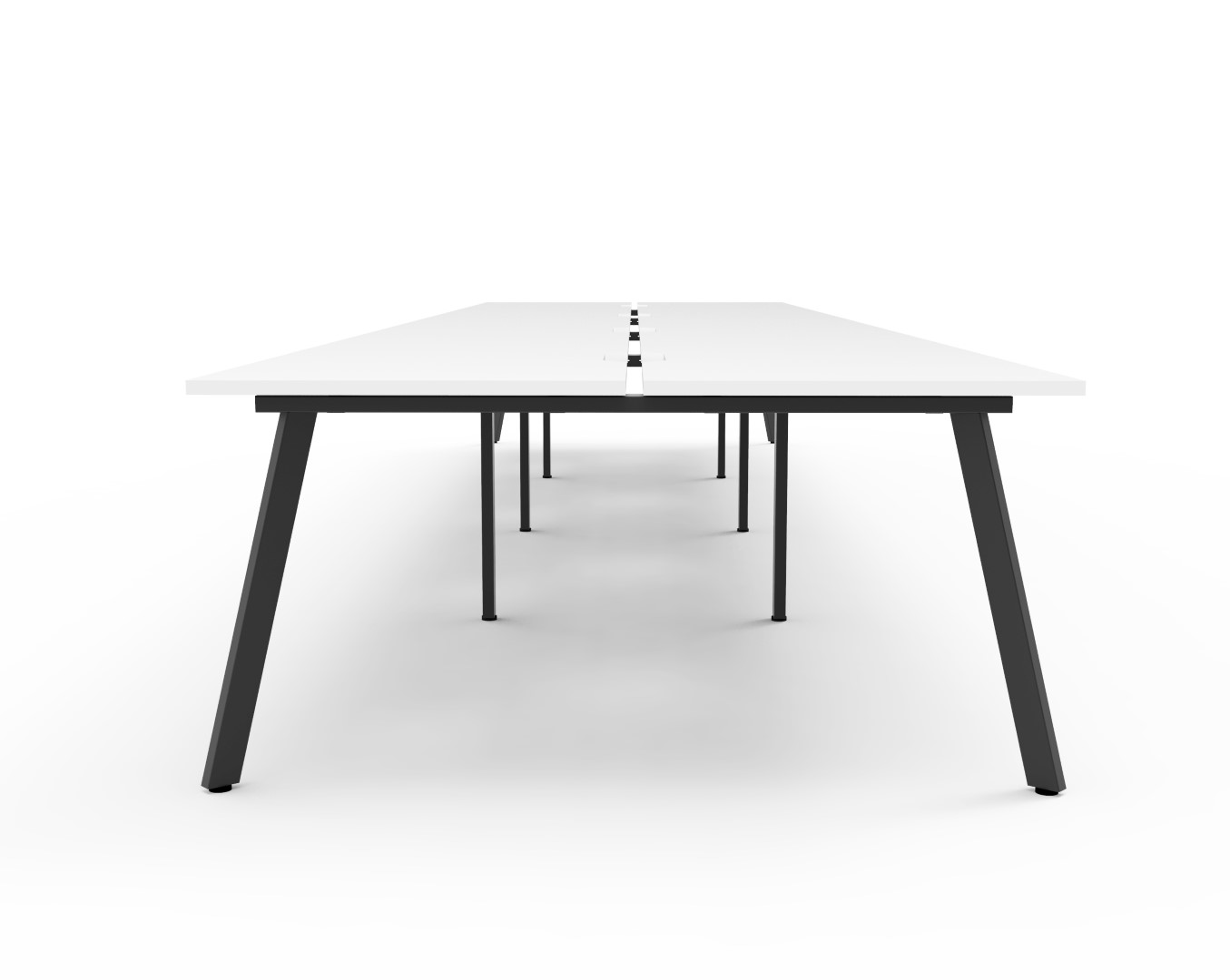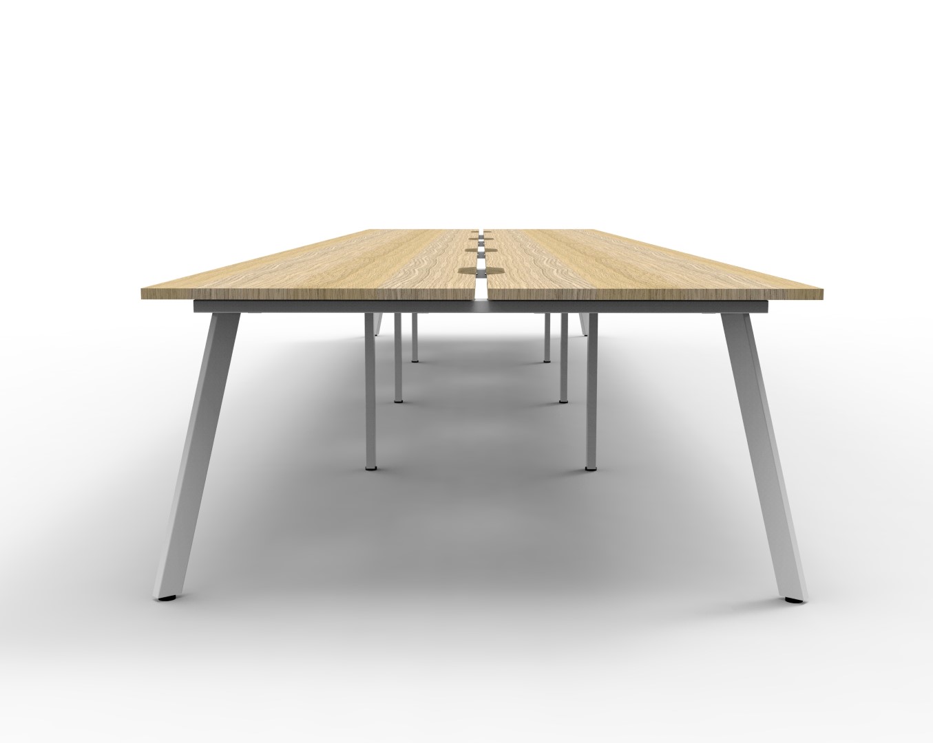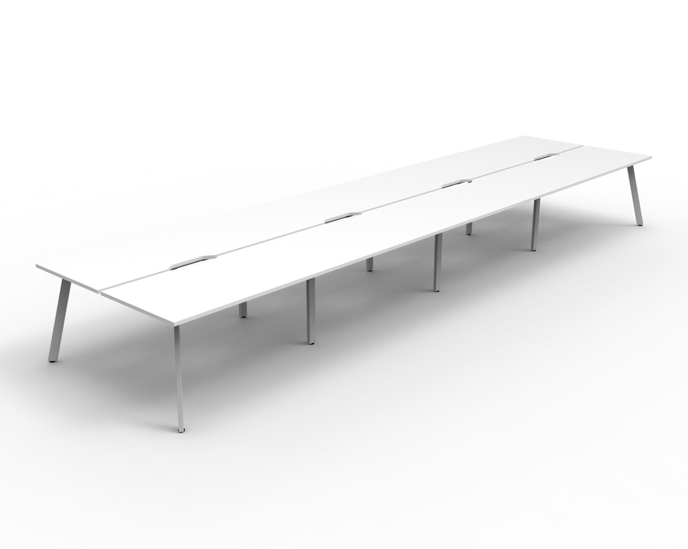 Eternity 8 Person Double Sided Workstation – No Screen | E0 Enviroboard Top With 410mm W x 50mm D Scallop | 30mm Cable Access Void In Between Double Sided Users – Infill Rail Avail. At An Additional Cost | 6000mm W x 1530mm D x 730mm H ( Overall ), 1500mm W x 750mm D x 730mm H Per User | 60mm x 30mm Splayed Leg, P/C Underframe | Adjustable Levelling Feet|Dual Cross Bar For Added Stability