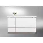 Contemporary and classy with pleasing lines. Counter body in metallic grey with feature Aluminium strips and contrasting jade white stone hob. Matt teak/white desk top and stainless steel kick plate, with left curved return.