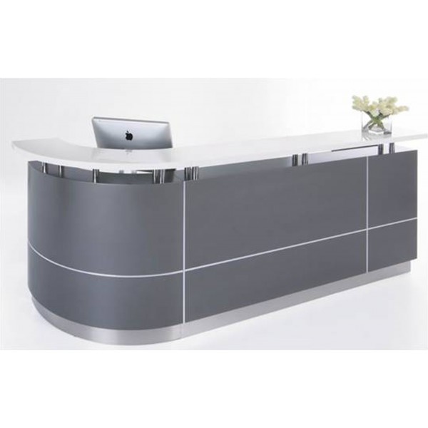 Contemporary and classy with pleasing lines. Counter body in metallic grey with feature Aluminium strips and contrasting jade white stone hob. Matt teak/white desk top and stainless steel kick plate, with left curved return.