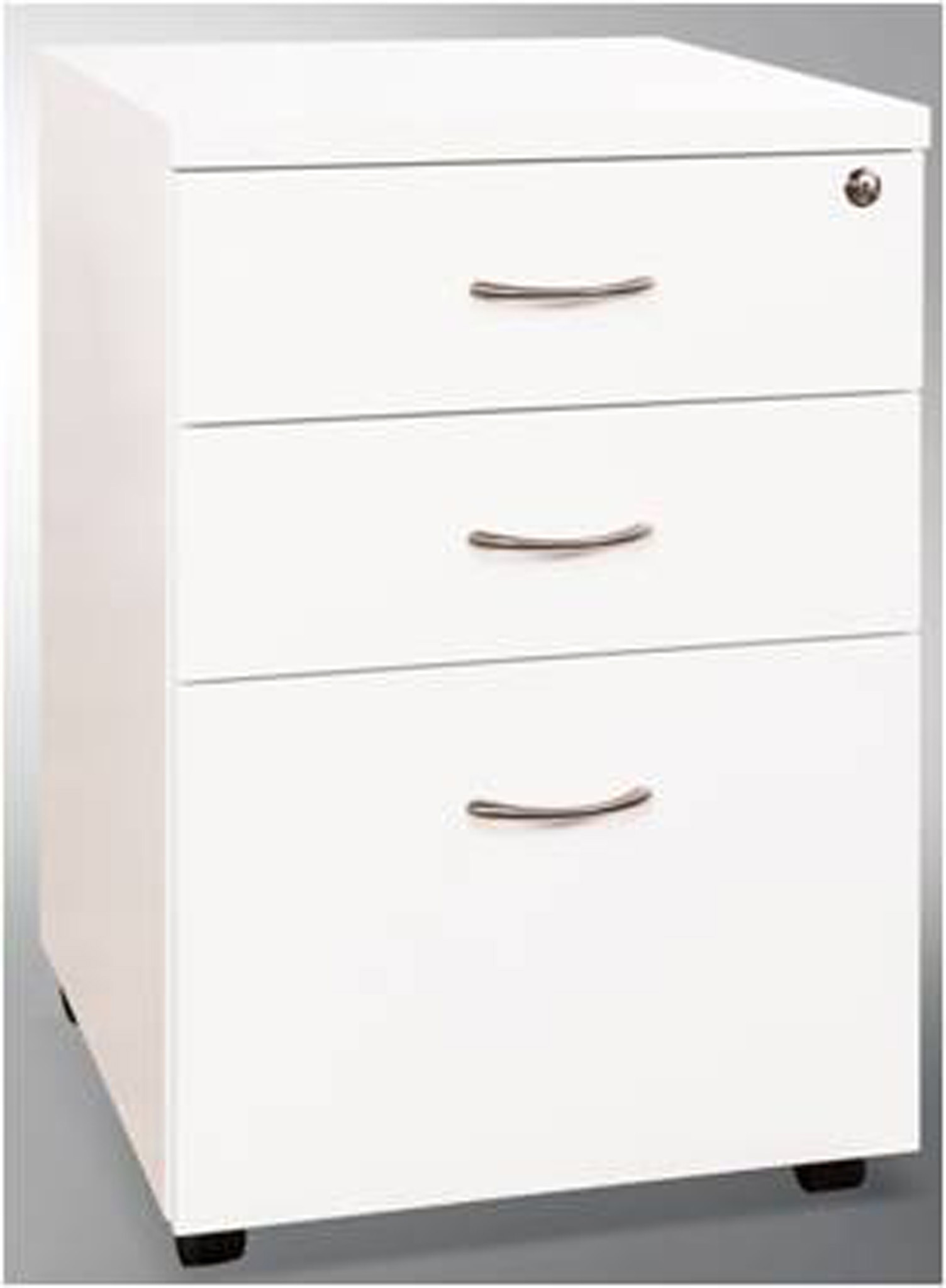 Mobile Pedestal, 2 pencil drawers and 1 filing drawer, with multi lock. Finished in high quality 2 pack paint in super gloss white.