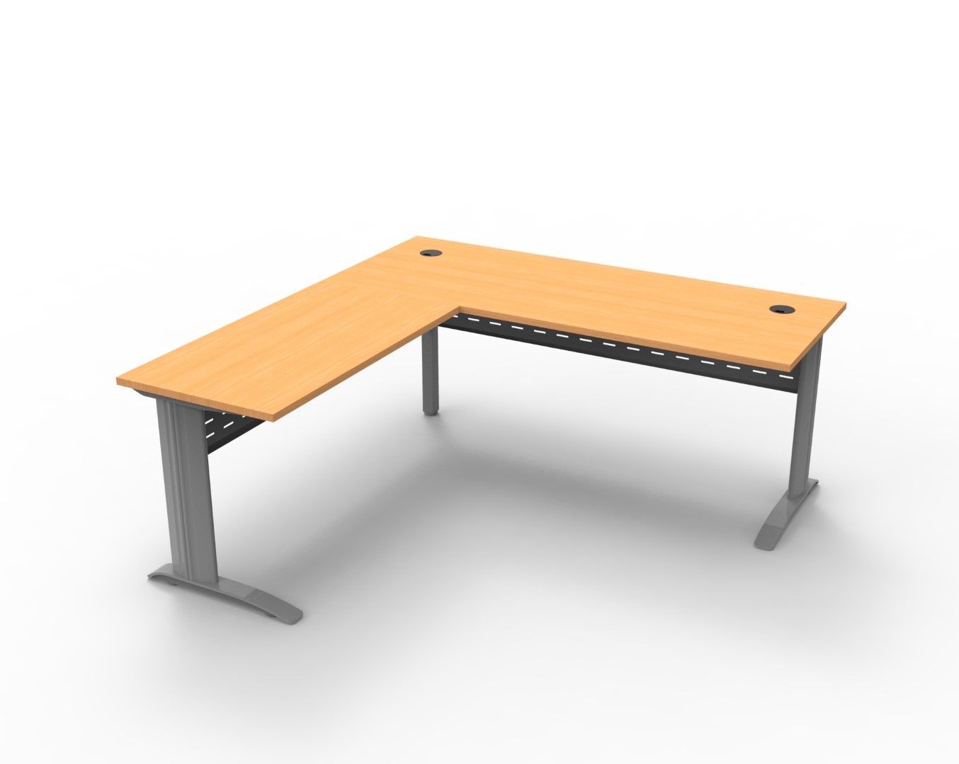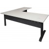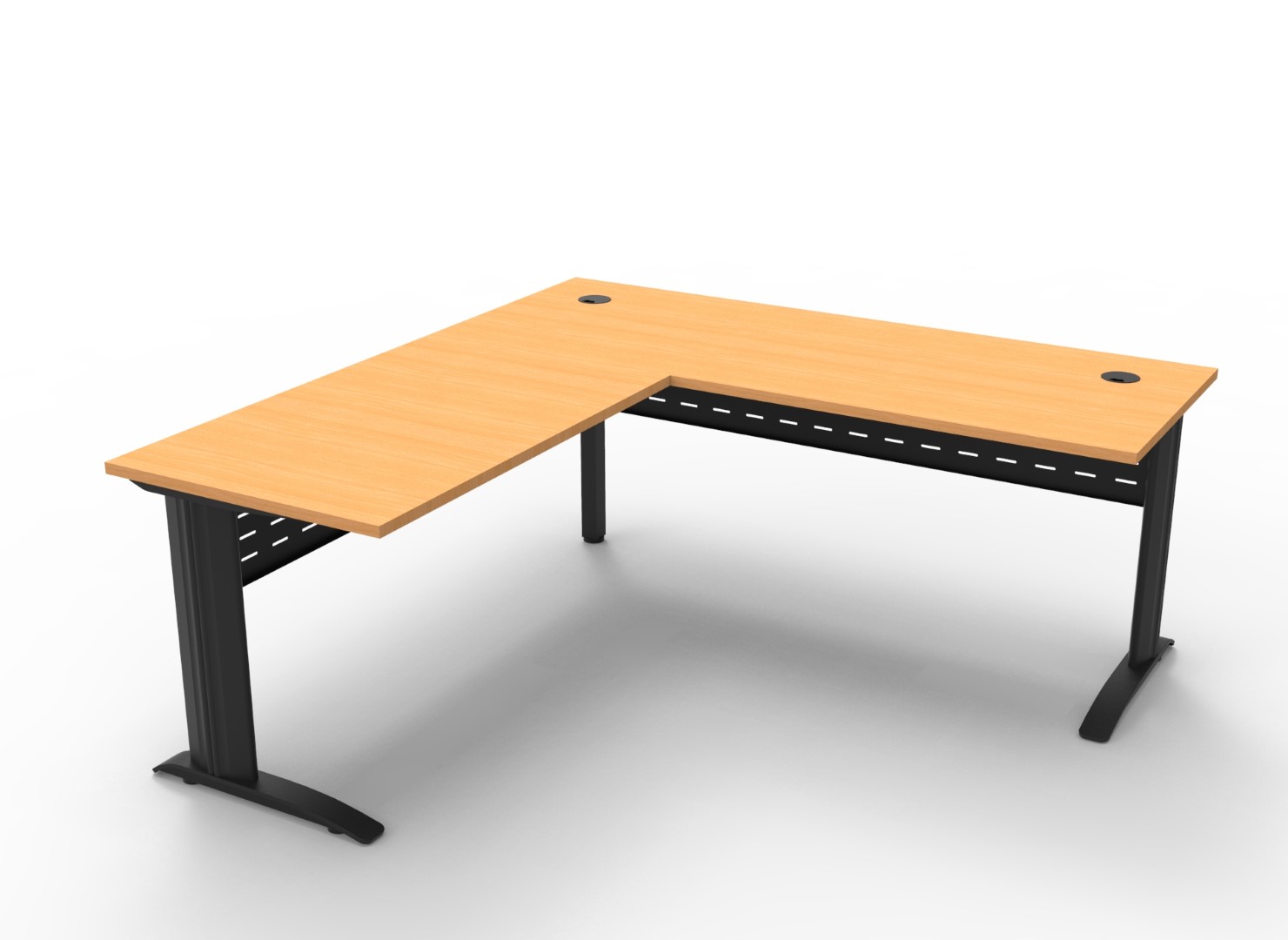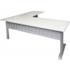The desk and return allows ample work space, ideal for a stand alone desk, with an E1 top with cable tidy, perforated metal modesty and adjustable feet.