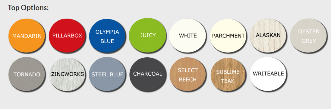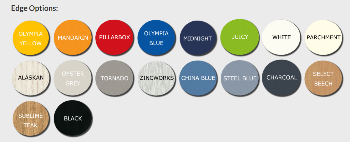 Please note: We’ve made every effort to present the colours on this document as close as possible to the ones you’ll use. Unfortunately, we cannot guarantee an exact colour match. Other tray and laminate colours available, longer lead times may apply.