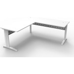 Corner workstations come with an E1 one piece top with cable tidy, perforated metal modesty panel and adjustable feet.